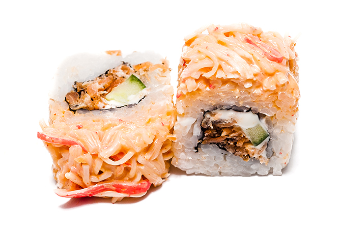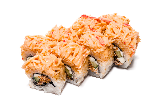 Жареный лосось, снежный краб, огурец, плавленый сыр, острый соус